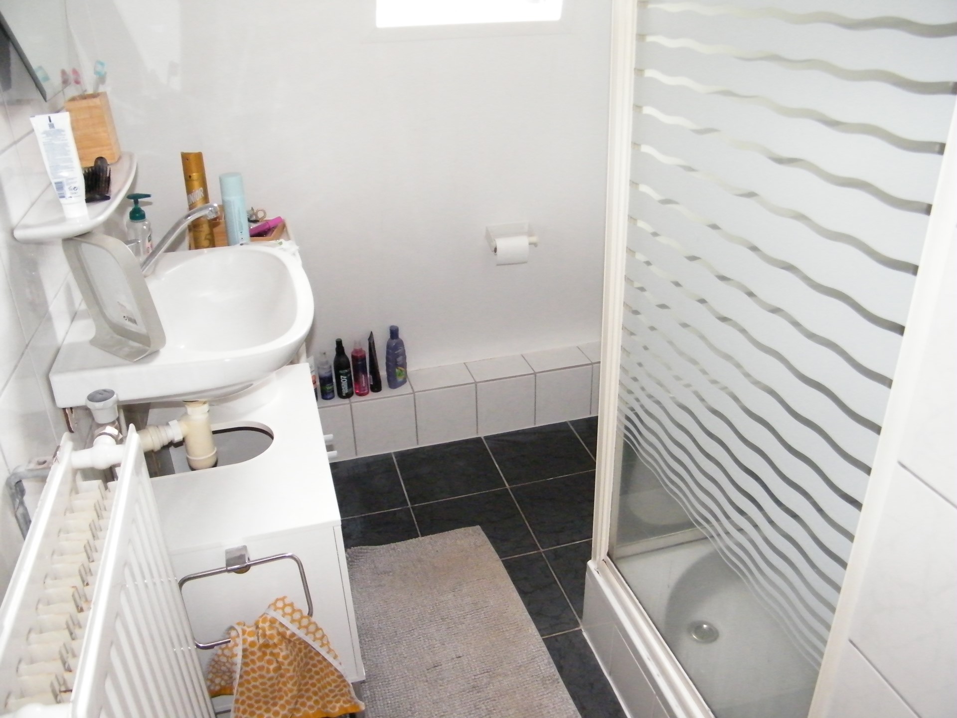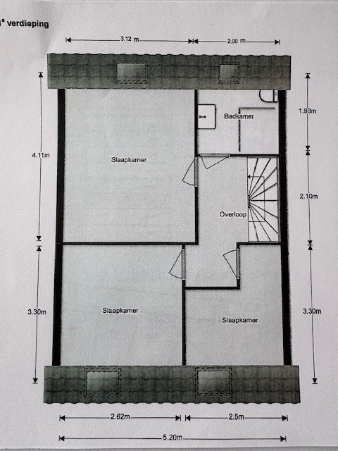 overloop met drie slaapkamer met ramen of dakramen, betegelde badkamer met douchecabine, wastafel en tweede toilet